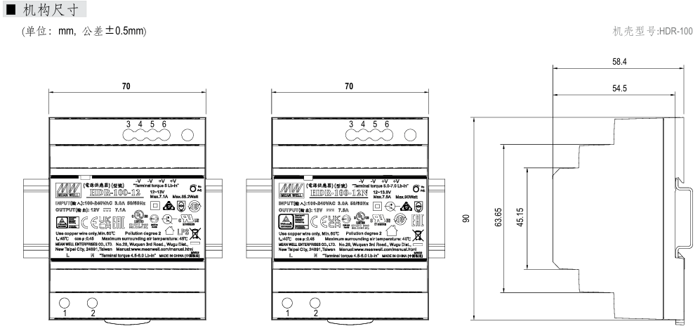 HDR-100 : 額定輸出功率的102 ~ 110%; HDR-100-xxN : 額定輸出功率的105 ~ 150% |