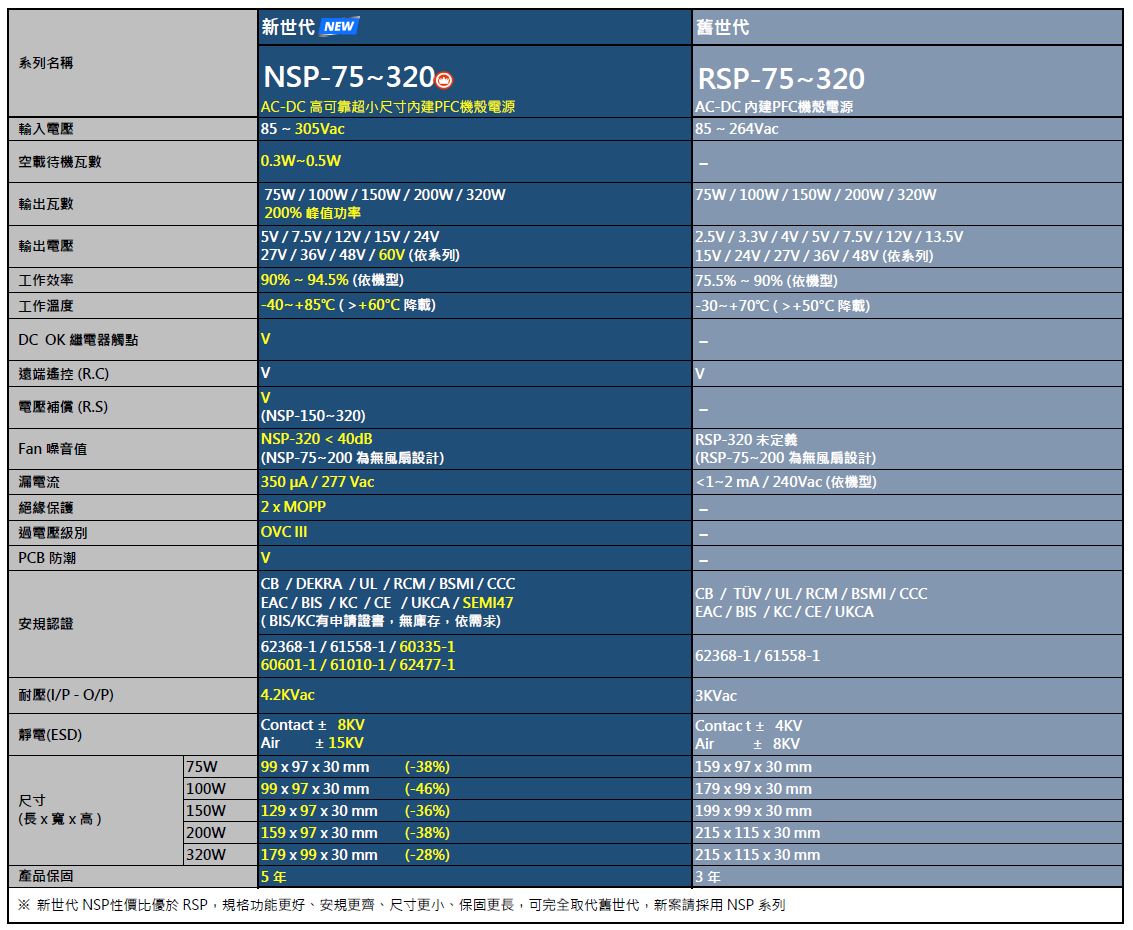 NSP-75/100/150/200/320 系列: 75W~320W新世代內建PFC高可靠小型高效機殼電源