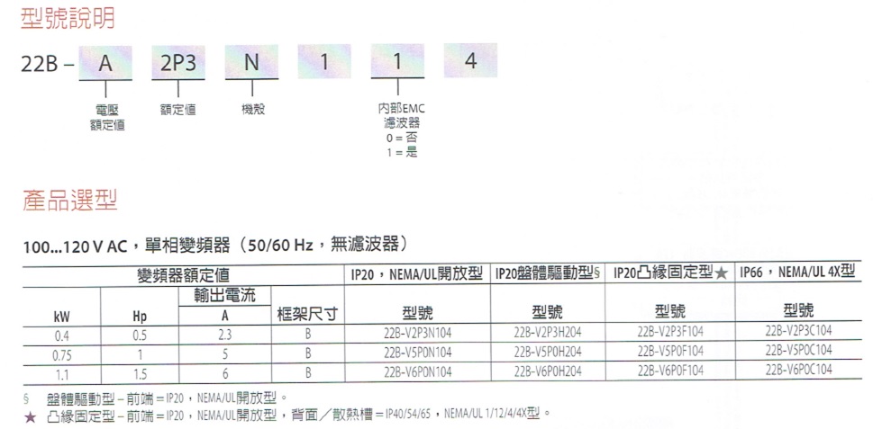 100 - 120 V:0.4 - 1.1 kW / 0.5 - 1.5 Hp / 2.3 - 6 A